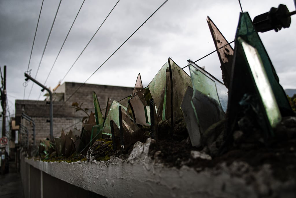 Como es de esperarse en Quito durante estos meses, una tarde lluviosa y gris deja ver el brillo que aún perdura, con dificultad, en los filos de los vidrios que descansan sobre algunos muros de la ciudad.