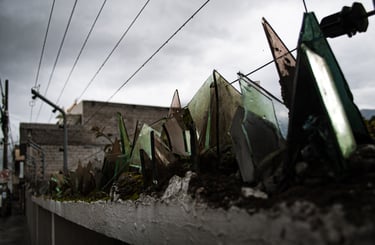 Pero no están solos, tienen cobijo en el musgo que se extiende desde el concreto hasta un sombrero electrizante, más moderno y quizás aún más llamativo que su propio brillo. Hoy en día esos vidrios ya no reflejan la luz como antes, han perdido su valor. Solo les queda difuminarse junto con la costumbre de aceptar el peligro como una compañía constante.